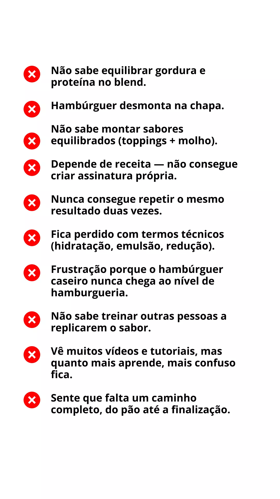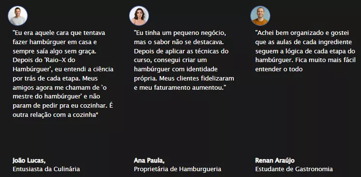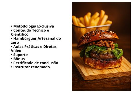 "Eu tinha um pequeno negócio, mas o sabor não se destacava. Depois de aplicar as técnicas do curso, consegui criar um hambúrguer com identidade própria. Meus clientes fidelizaram e meu faturamento aumentou."