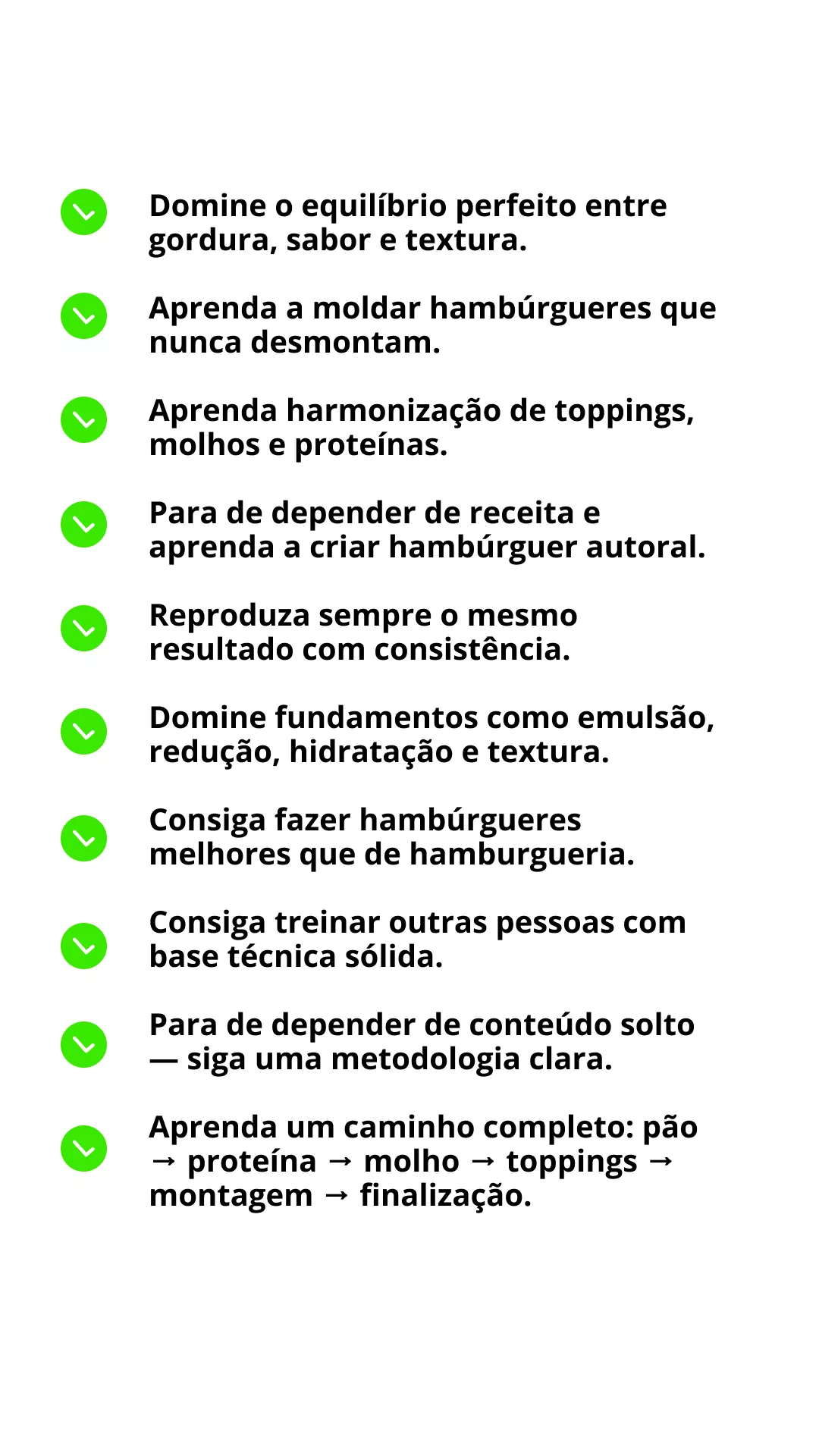 Pequenos Empreendedores e Chefs de Cozinha: Donos de hamburguerias artesanais, food trucks ou cozinheiros que desejam inovar, diferenciar seu produto no mercado e elevar a qualidade de seus hambúrgueres, incorporando técnicas e conceitos mais avançados.